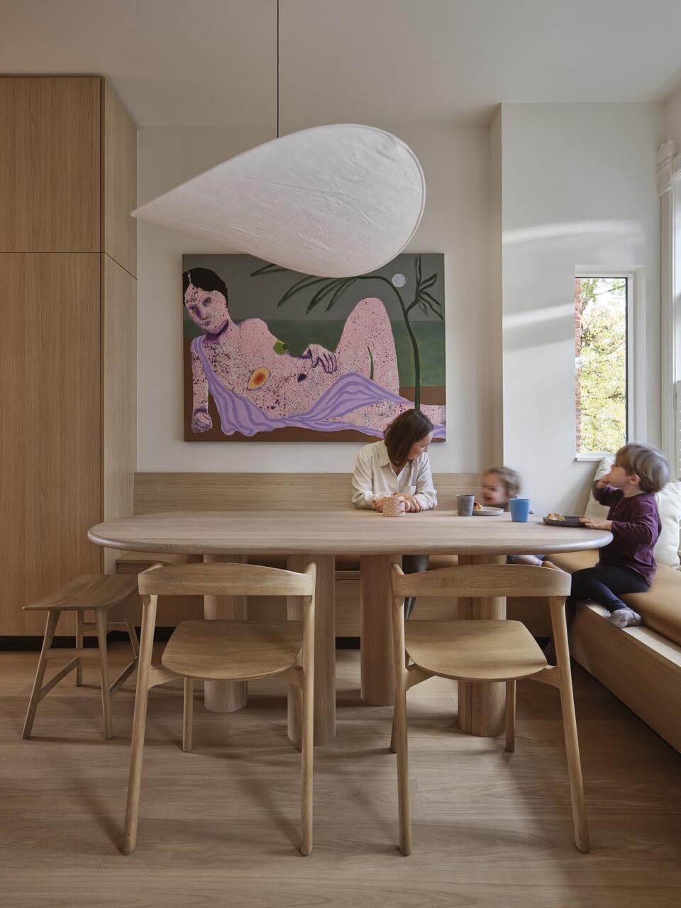 Spatial optimization by means of integrated millwork was central to the design solutions of this narrow home. In the dining room, a banquette gracefully curves within the existing bay window, offering a convivial space for communal gatherings while maintaining a fluid transition from entryway to kitchen.